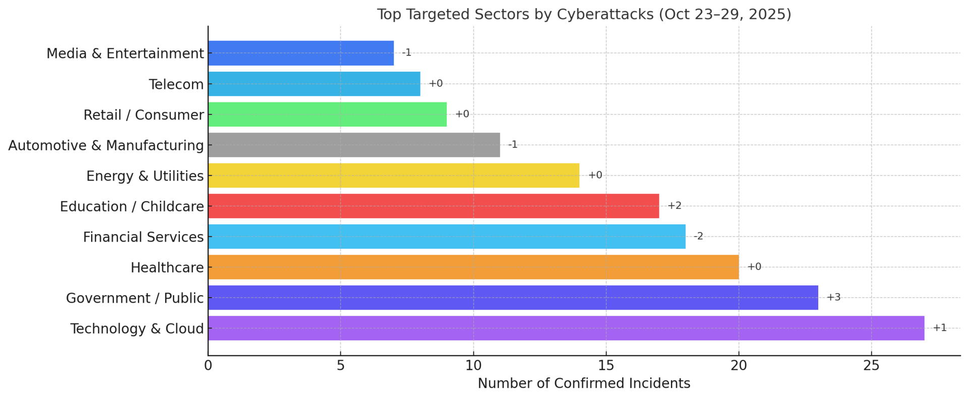 Technology & Cloud: Remains the most targeted sector — Microsoft, VMware, and Google issued out-of-band patches; AI-driven phishing kits surged 900% YoY.