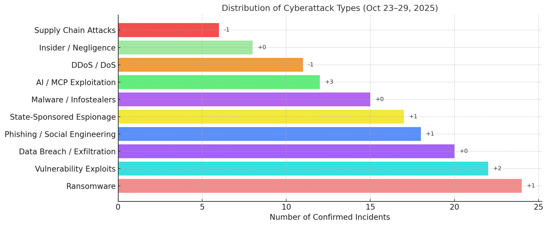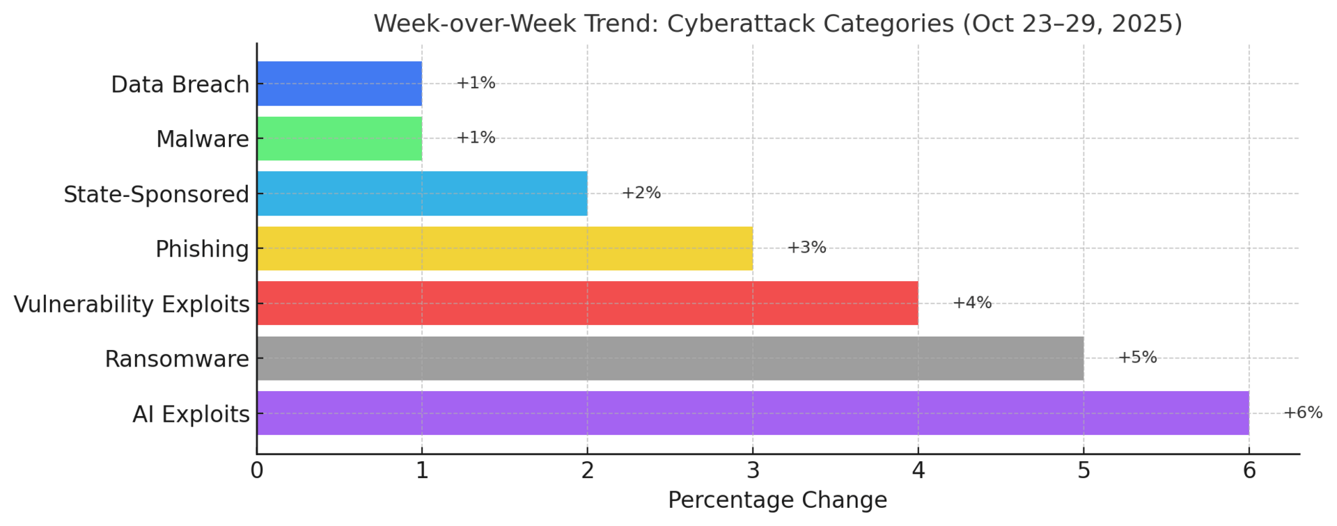 AI / MCP Exploitation: Up +6% WoW; threat actors deploying generative AI for spear-phish automation, voice-clone scams, and deepfake job recruitment.