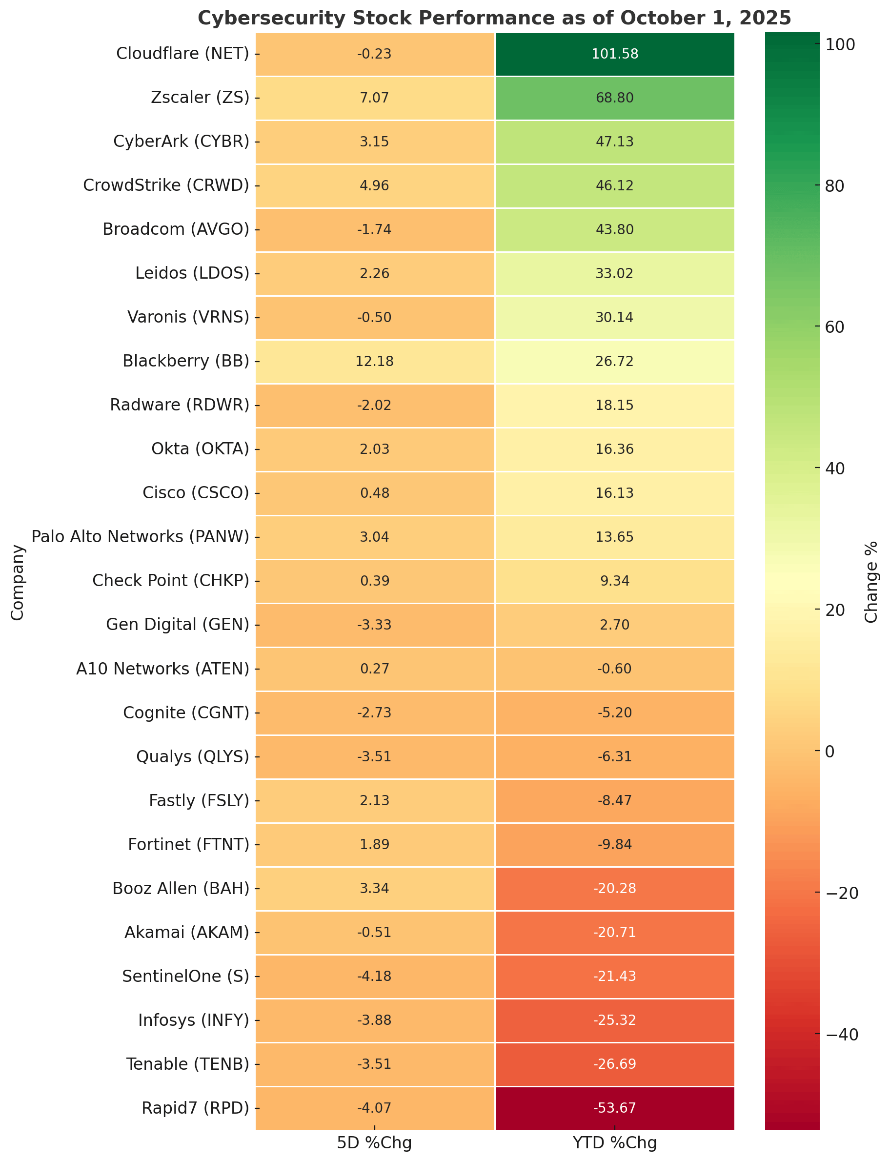 Year-to-date, Cloudflare (+101.6%), Zscaler (+68.8%), and CyberArk (+47.1%) dominate the leaderboard, showcasing cloud-first adoption and hardware-bound identity security. At the other end, RPD, TENB, and INFY underscore ongoing difficulties for players without scale or differentiated IP.