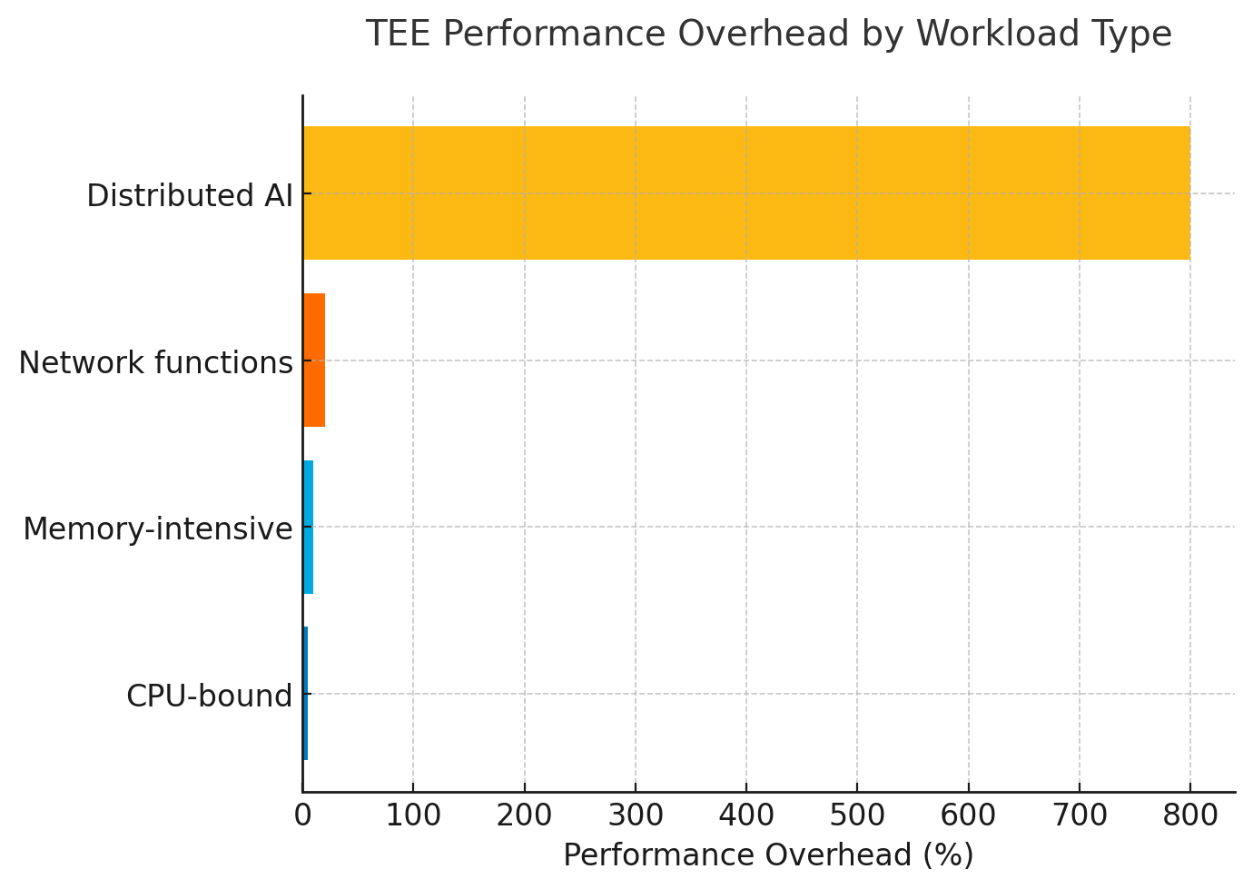 Architectural convergence with performance implications: Enterprise deployment has consolidated around Confidential Virtual Machines (CVMs) from AMD SEV-SNP, Intel TDX, and ARM CCA architectures. While CPU-bound workloads show manageable overhead (2-10%), analysis of 15 production AI deployments reveals that distributed GPU training with TEEs imposes 8x average runtime increases, peaking at 41.6x for specific configurations. This performance tax must be incorporated into all Total Cost of Ownership models.