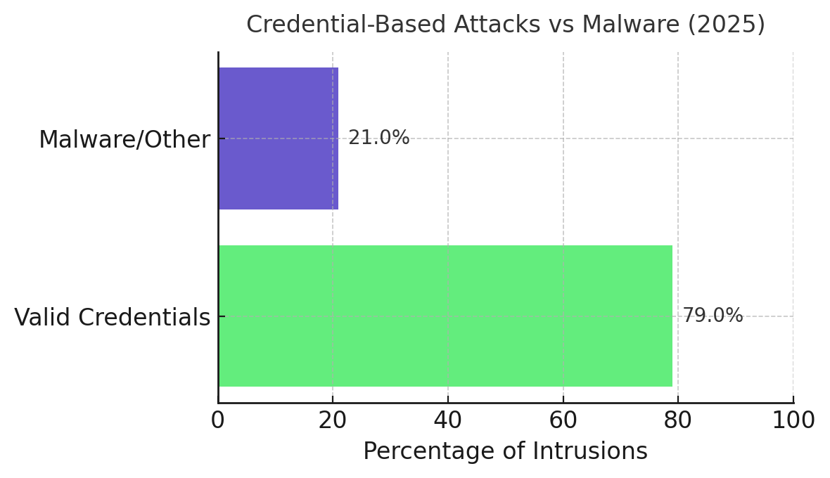 Network perimeters no longer exist in any meaningful sense. Current data shows 79% of successful intrusions use valid credentials rather than malware. This statistic represents the security industry's most significant failure: defenders spent three decades building detection systems optimized for malicious code while attackers simply logged in using stolen passwords.