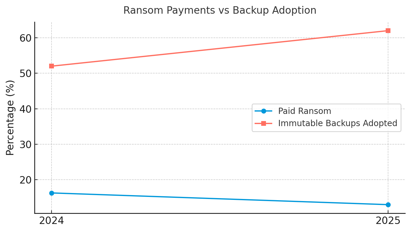 Something unexpected happened in 2025: defenders started winning the economics war. Only 13% of ransomware victims paid ransoms, down from 16.3% in 2024. This decline represents the first meaningful shift in bargaining power since ransomware industrialized. Organizations achieved this through a straightforward insight: immutable backups are cheaper than ransom payments. The adoption rate reached 62% of enterprises, while 82% maintain tested disaster recovery plans. These investments fundamentally altered criminal economics.